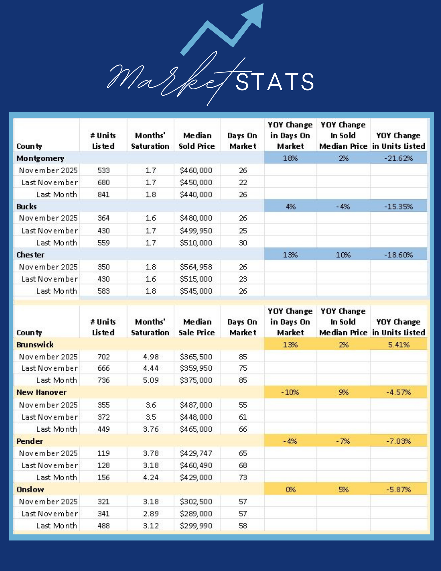 We put together a quick breakdown of what’s happening in our Pennsylvania and North Carolina markets, county by county. Watch the video for a short overview, then check out the stats below—just remember, real estate is hyper-local, and this is big-picture data.